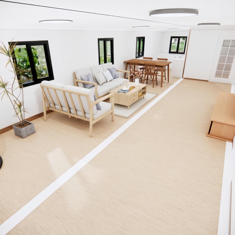 The Prefab House frame construction is black, made of thick galvanized steel square tube. Exterior wall panels made of wood-grained galvanized steel sheets, interior wall panels are white galvanized steel sheets, with a 75cm thickness of flame-retardant foam board in between.