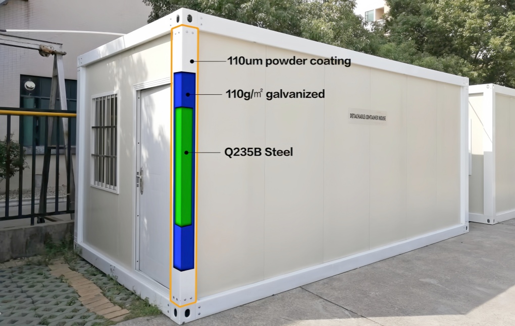 A7:Wall panels are made of 50mm rock wool sandwich panels, and can be upgraded to 75mm and 100mm thickness, which is better for extreme cold and hot weather