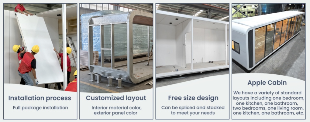 In terms of installation, the modular feature of the Apple Pod enables it to be installed quickly in most areas. A standard unit of approximately 19 feet can be assembled by skilled workers in just about 8 hours, and the internal accessories, decorations, electrical and pipe joints are also pre-installed. The wall also supports secondary disassembly and assembly, facilitating layout adjustment or reuse in the future. Before leaving the factory, our factory will first complete the installation of the finished products. After being tightly packaged as a whole, they only need to be moved by cranes or forklifts. They can be moved anytime and anywhere, are lightweight and easy to handle, and can be used immediately after installation.